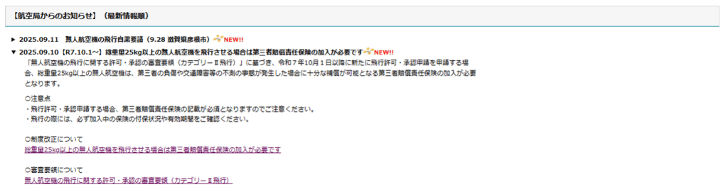 総重量25kg以上の機体で行う特定飛行については、10月1日以降に新規で許可・承認申請される場合は注意が必要です。(以下案内メールより)